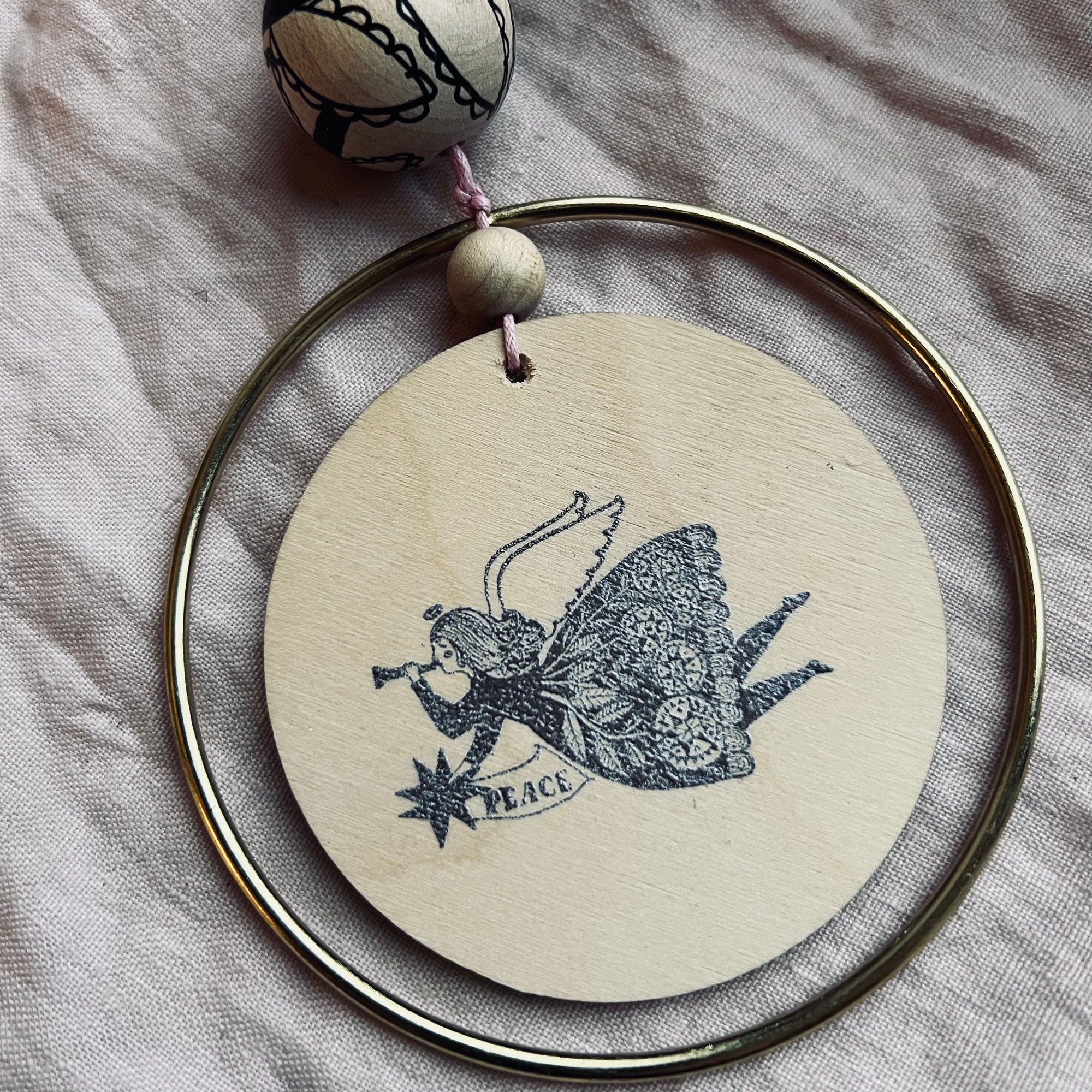 Hand made with a gold hoop, hand printed wooden disc and illustrated bead.