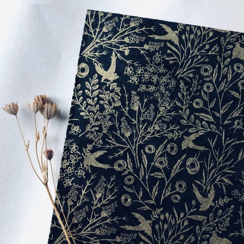 Skilfully handmade lokta paper with a beautiful gold block printed bird and botanical design.